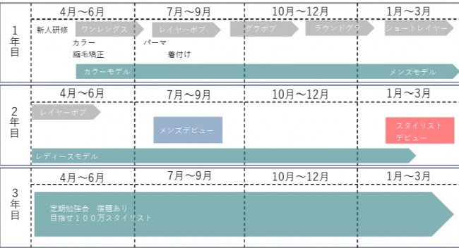 rodinaでは新卒入社から1年6カ月でメンズデビュー、2年以内でスタイリストデビューを目標としていて、新卒入社後3年で100万スタイリストを目指します。